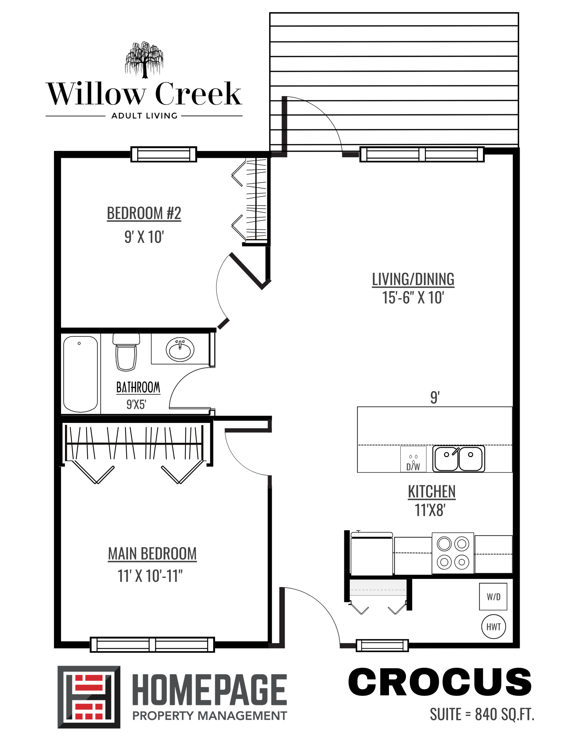 The Crocus offers comfortable single-level living with a smart, efficient layout. At 840 sq. ft., this suite comfortably includes 2 bedrooms, 1 bathroom, and a bright open-concept kitchen, dining, and living area. The kitchen comes equipped with stainless steel appliances, and in-suite laundry adds everyday convenience.